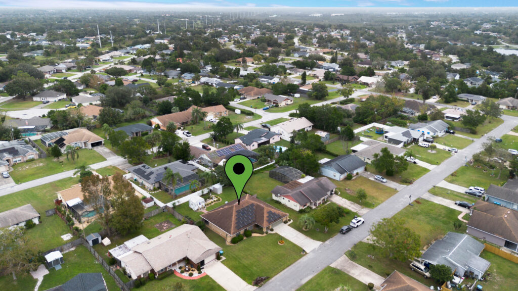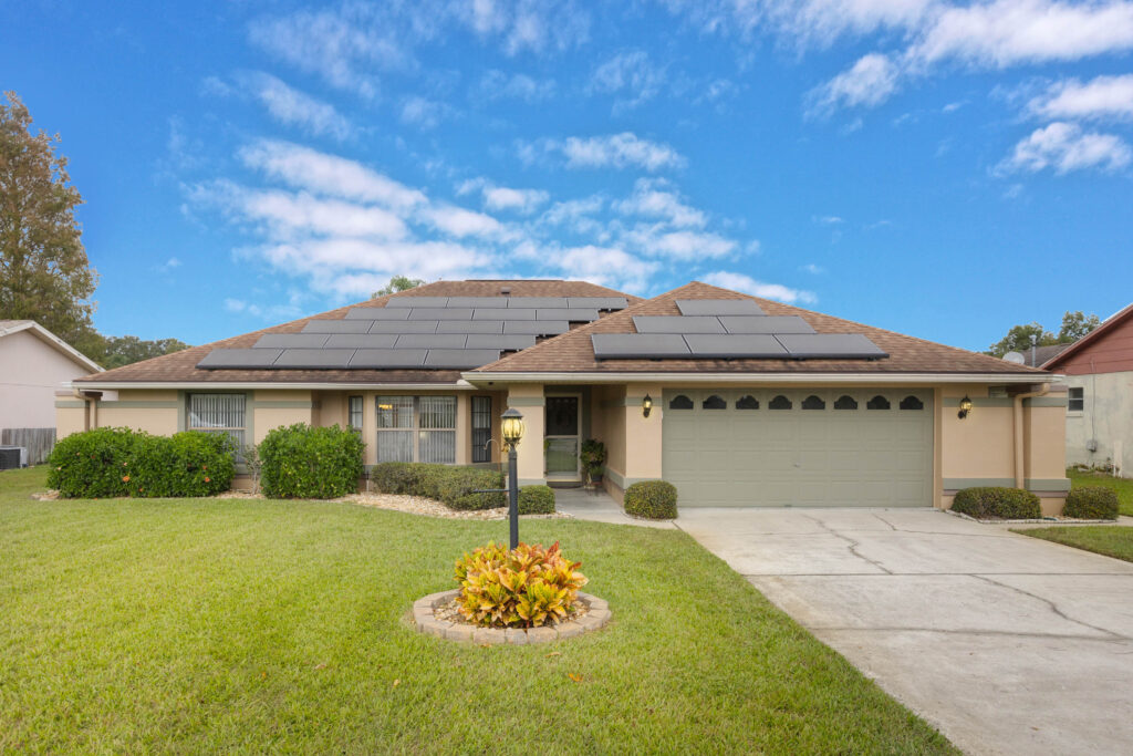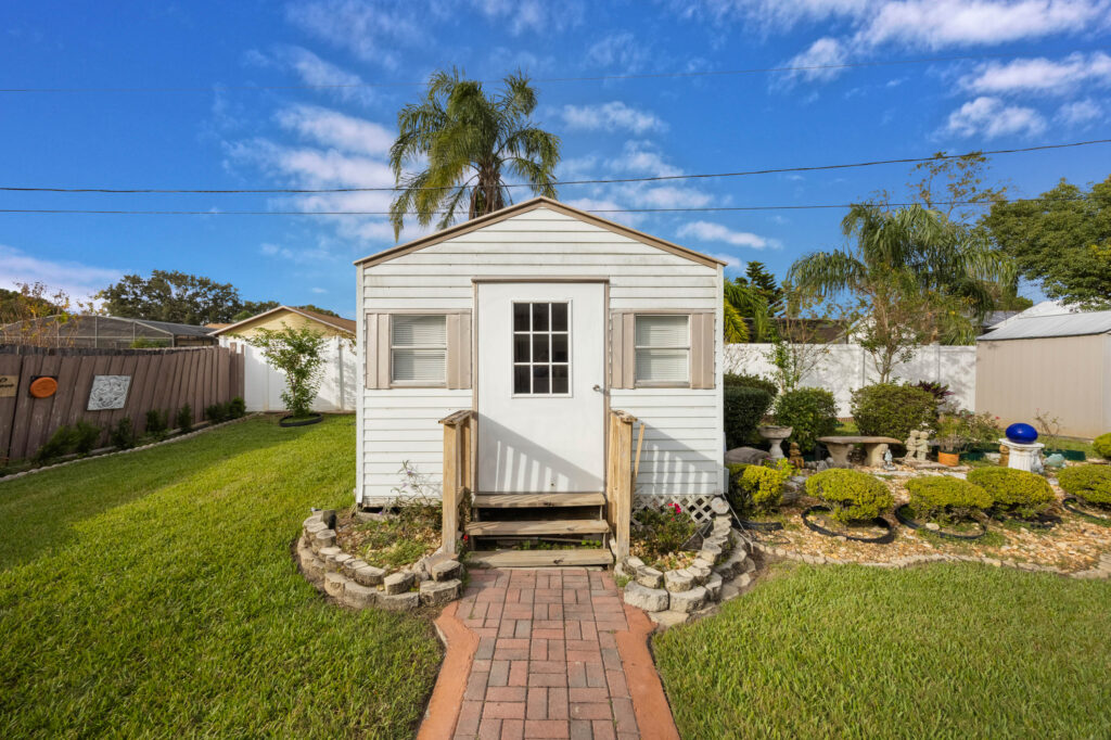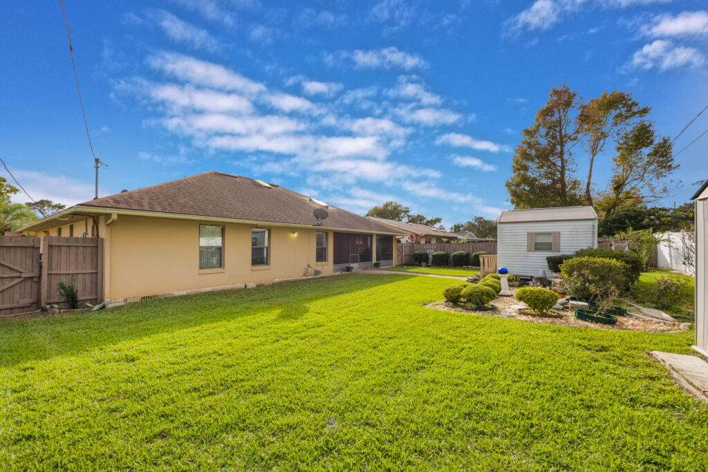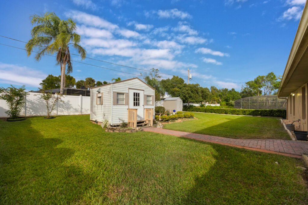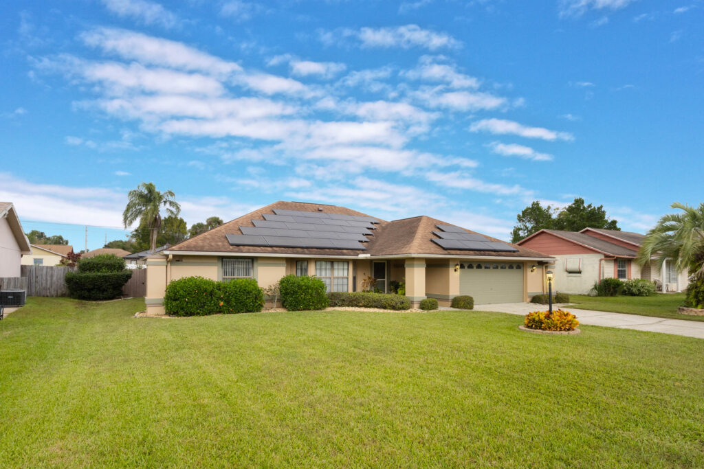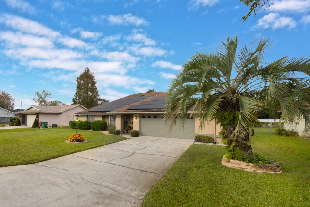 This 3-bedroom stucco beauty has been meticulously maintained and includes recently installed solar roof panels. The home has a great single-level layout, with vaulted ceilings and plenty of natural light. Just beyond the large living room, the kitchen features a dining nook, granite countertops, and a breakfast bar with seating for a crowd. The kitchen is open to both the formal dining room and the family room at the rear of the floorplan. A few steps away, you’ll spend lots of time relaxing in that screened-in lanai, complete with a skylight and ceiling fan. The fenced-in backyard includes landscaped planting beds and two storage sheds. Speaking of sheds, the larger shed has been converted into an art studio and is decked out with A/C and running water. This would make the perfect man cave, she-shed, home office, or climate control storage. The primary bedroom boasts a massive ensuite with a walk-in closet, dual sinks, a makeup vanity, a soaking tub, and a separate shower. It even has direct access to the lanai. On the other side of the floorplan, the guest rooms share the second full bathroom. Those solar panels on the roof will keep your utility bills low, and don’t forget about all the storage in the 2-car garage! This quiet neighborhood puts you close to parks, schools, and medical centers. You’ll be just 5 mins from all the shopping & dining along Saxon Blvd., with easy access to I-4, too. Less than 45 minutes to both Orlando and Daytona Beach!