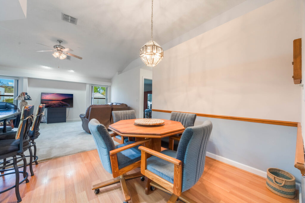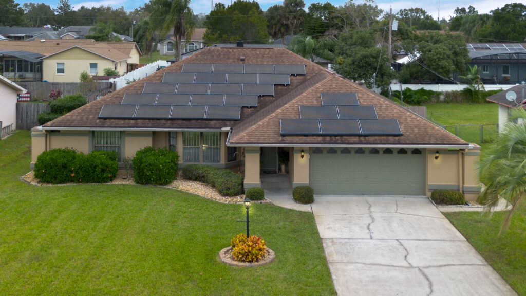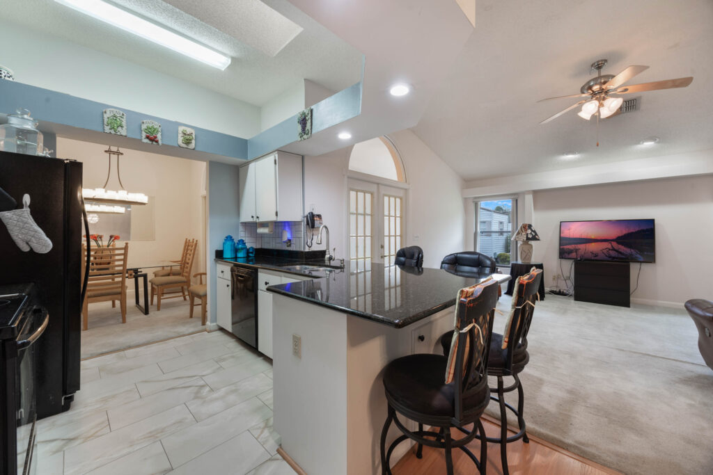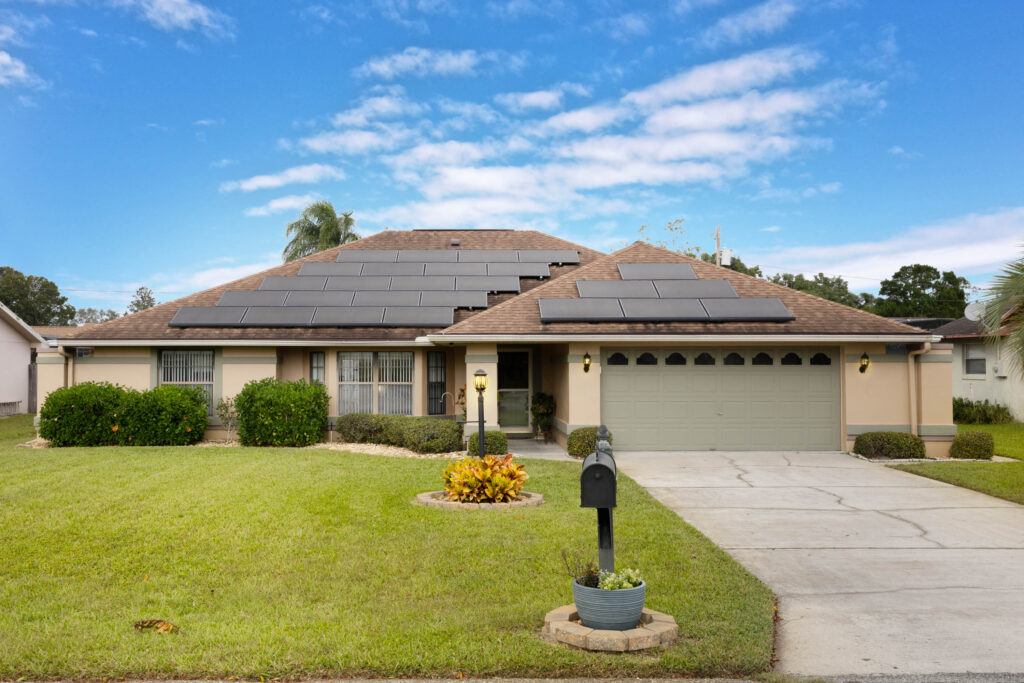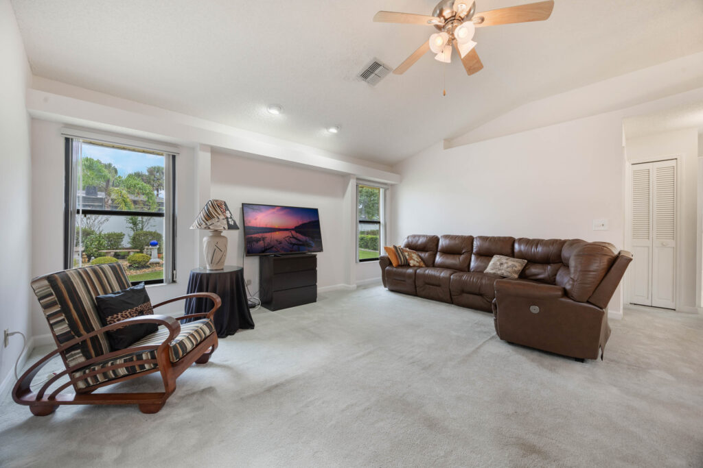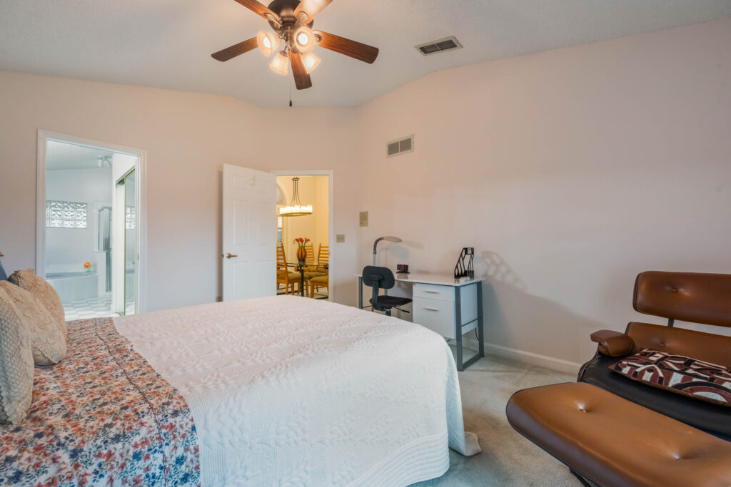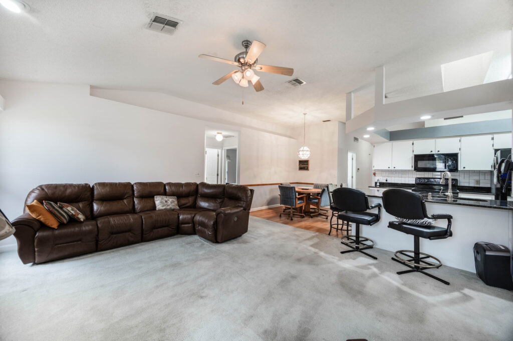 This 3-bedroom stucco beauty has been meticulously maintained and includes recently installed solar roof panels. The home has a great single-level layout, with vaulted ceilings and plenty of natural light. Just beyond the large living room, the kitchen features a dining nook, granite countertops, and a breakfast bar with seating for a crowd. The kitchen is open to both the formal dining room and the family room at the rear of the floorplan. A few steps away, you’ll spend lots of time relaxing in that screened-in lanai, complete with a skylight and ceiling fan. The fenced-in backyard includes landscaped planting beds and two storage sheds. Speaking of sheds, the larger shed has been converted into an art studio and is decked out with A/C and running water. This would make the perfect man cave, she-shed, home office, or climate control storage. The primary bedroom boasts a massive ensuite with a walk-in closet, dual sinks, a makeup vanity, a soaking tub, and a separate shower. It even has direct access to the lanai. On the other side of the floorplan, the guest rooms share the second full bathroom. Those solar panels on the roof will keep your utility bills low, and don’t forget about all the storage in the 2-car garage! This quiet neighborhood puts you close to parks, schools, and medical centers. You’ll be just 5 mins from all the shopping & dining along Saxon Blvd., with easy access to I-4, too. Less than 45 minutes to both Orlando and Daytona Beach!