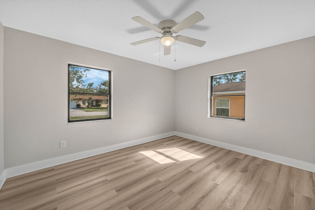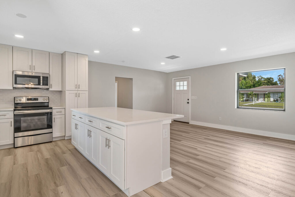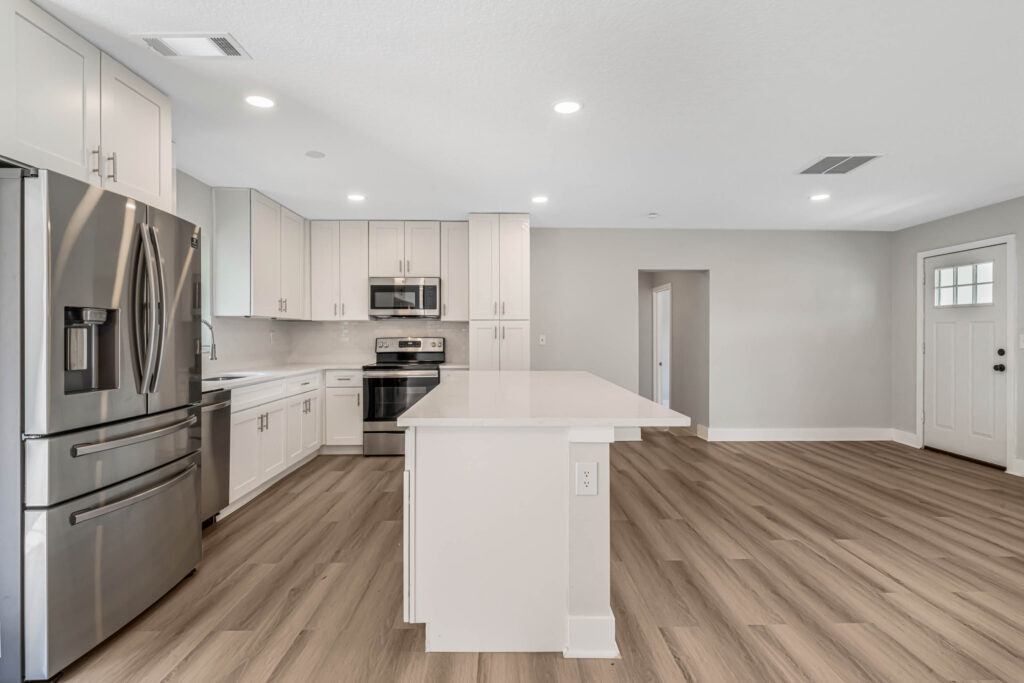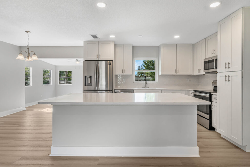 HOLIDAY LIMITED-TIME OFFER. PRICE CUT FROM 319,900 TO $300,900. HURRY. OFFER ENDS SOON. Tour this modern farmhouse with fantastic curb appeal in a quiet neighborhood near Angela Lake. Nearly every square inch of this 4-bedroom home has been renovated, and you’ll notice high-quality finishes throughout, like marble window sills, linear shower drains, and recessed lighting. The open kitchen features Shaker cabinetry, stainless appliances, gorgeous quartz countertops, and an island with bar-top seating and tons of extra storage. Just off the kitchen, there’s a BONUS sunroom that could be your family room, home office, den, or playroom. Or it could serve as a drop zone/mudroom since it leads out to the back paver patio. The completely fenced-in yard has so much potential, as there is plenty of space for a future pool, playset, firepit, or garden. The entire home has luxury vinyl plank flooring (no carpets here!). Each bedroom includes a ceiling fan, and both bathrooms boast custom tilework and quartz-topped vanities. The home also has a large utility/laundry room as well as a wide driveway for extra parking or to store your boat. What a location! You’ll be less than half a mile from the Dupont Lakes Center, which includes Publix and lots of retail stores & restaurants. You can hop on I-4 in 10 minutes, with the beach just 35 minutes from your front door! Call your agent or Schedule your private showing today.