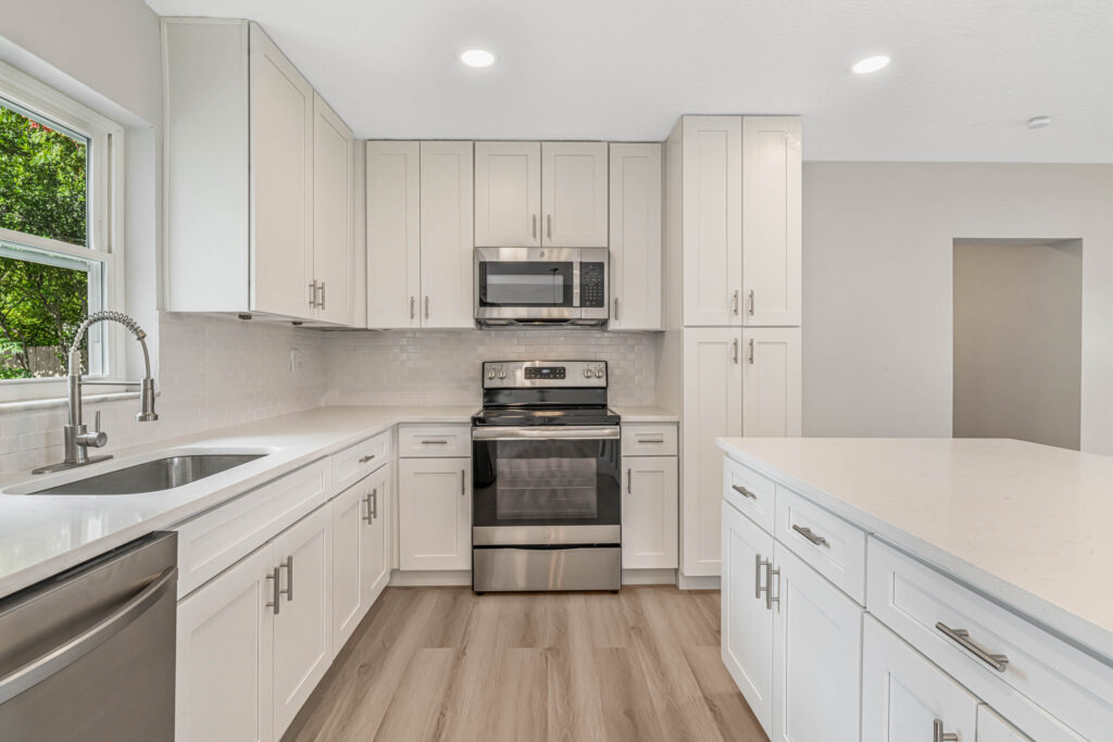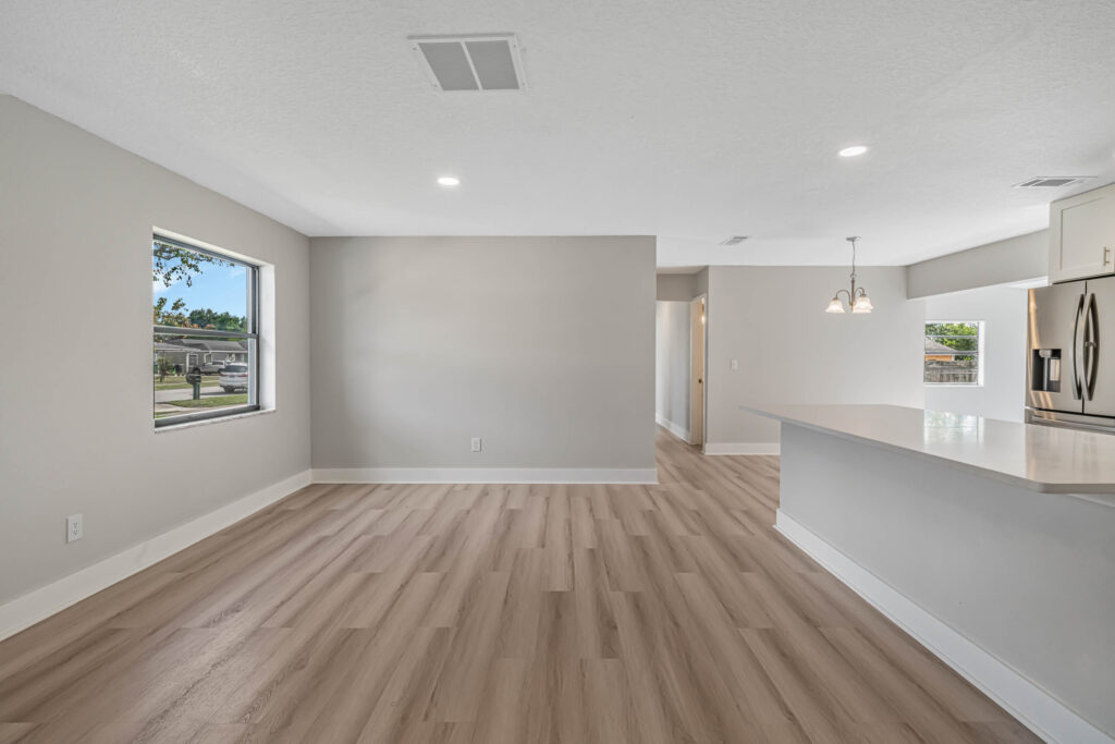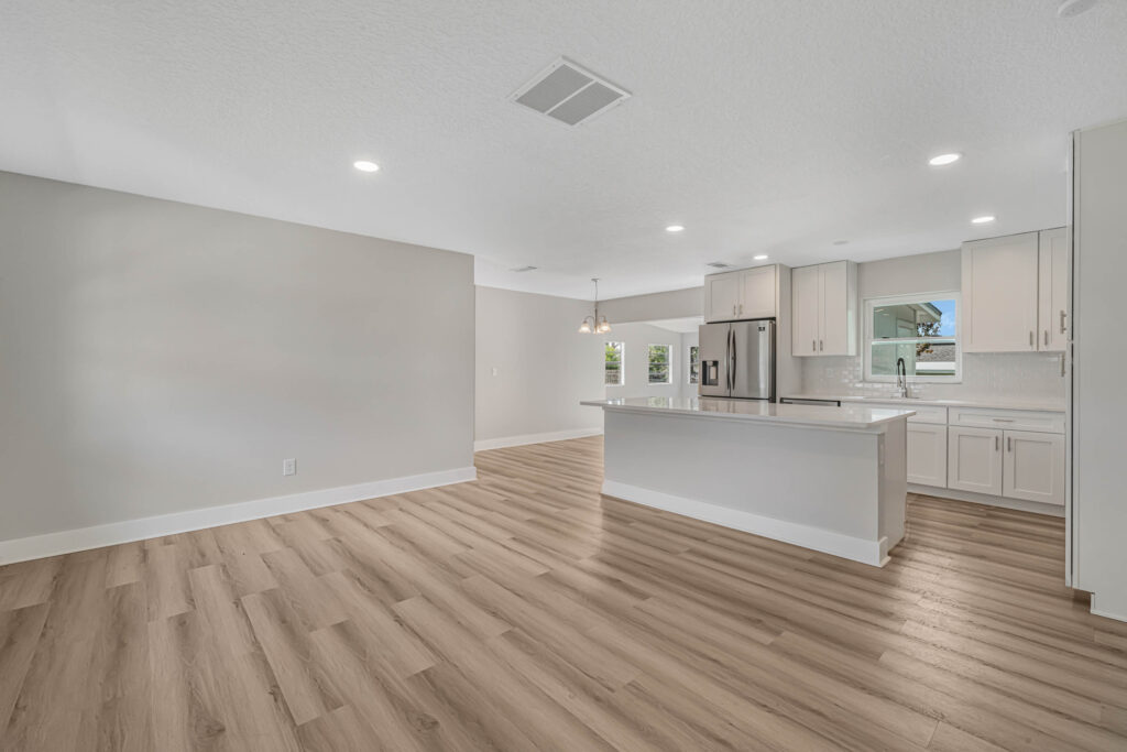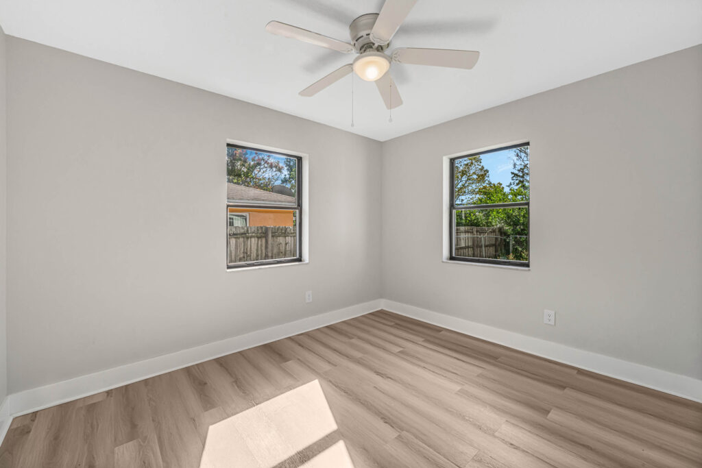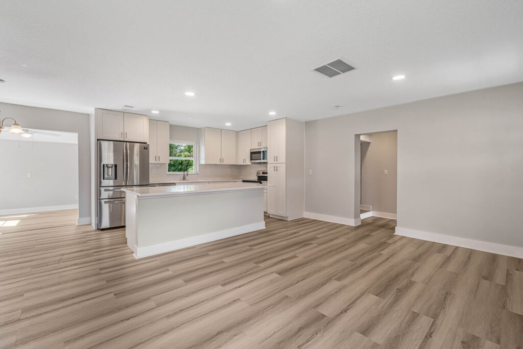 HOLIDAY LIMITED-TIME OFFER. PRICE CUT FROM 319,900 TO $300,900. HURRY. OFFER ENDS SOON. Tour this modern farmhouse with fantastic curb appeal in a quiet neighborhood near Angela Lake. Nearly every square inch of this 4-bedroom home has been renovated, and you’ll notice high-quality finishes throughout, like marble window sills, linear shower drains, and recessed lighting. The open kitchen features Shaker cabinetry, stainless appliances, gorgeous quartz countertops, and an island with bar-top seating and tons of extra storage. Just off the kitchen, there’s a BONUS sunroom that could be your family room, home office, den, or playroom. Or it could serve as a drop zone/mudroom since it leads out to the back paver patio. The completely fenced-in yard has so much potential, as there is plenty of space for a future pool, playset, firepit, or garden. The entire home has luxury vinyl plank flooring (no carpets here!). Each bedroom includes a ceiling fan, and both bathrooms boast custom tilework and quartz-topped vanities. The home also has a large utility/laundry room as well as a wide driveway for extra parking or to store your boat. What a location! You’ll be less than half a mile from the Dupont Lakes Center, which includes Publix and lots of retail stores & restaurants. You can hop on I-4 in 10 minutes, with the beach just 35 minutes from your front door! Call your agent or Schedule your private showing today.