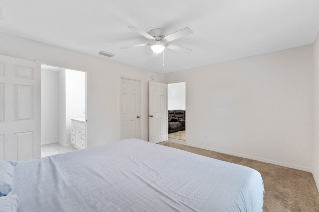 The primary suite, including a walk-in closet and a lovely ensuite, is isolated at the front of the floor plan. The guest rooms are on the other side of the house and share the spacious hallway bathroom.